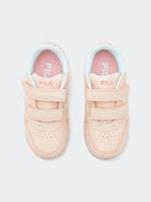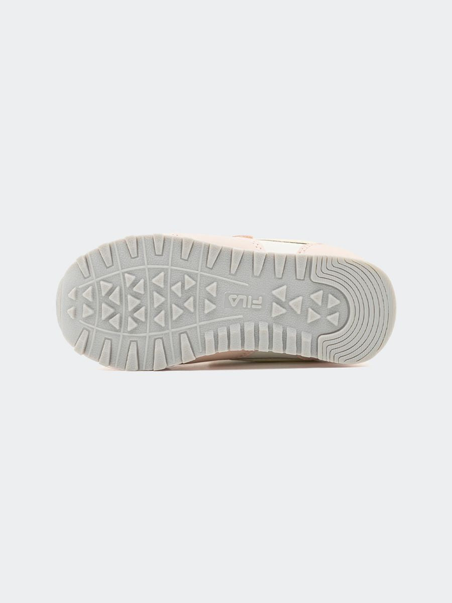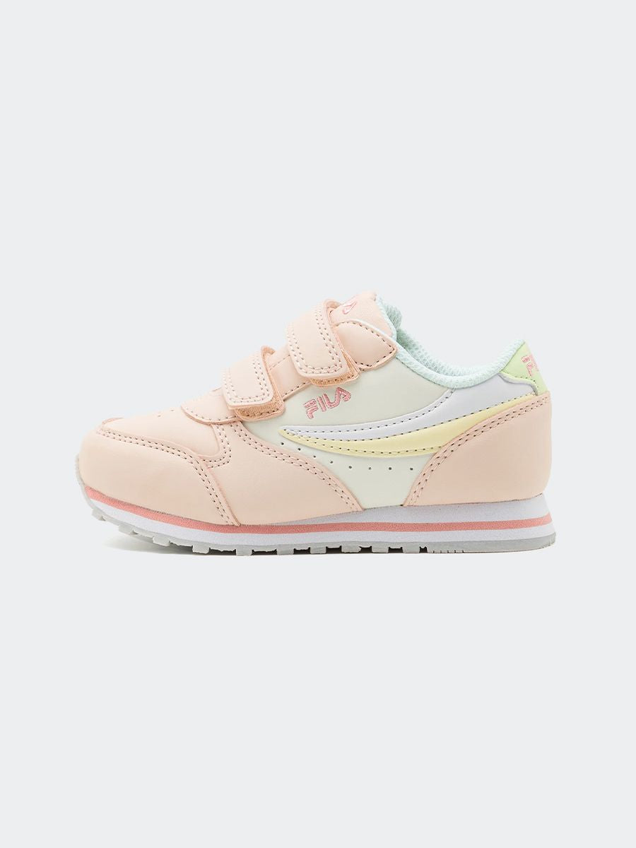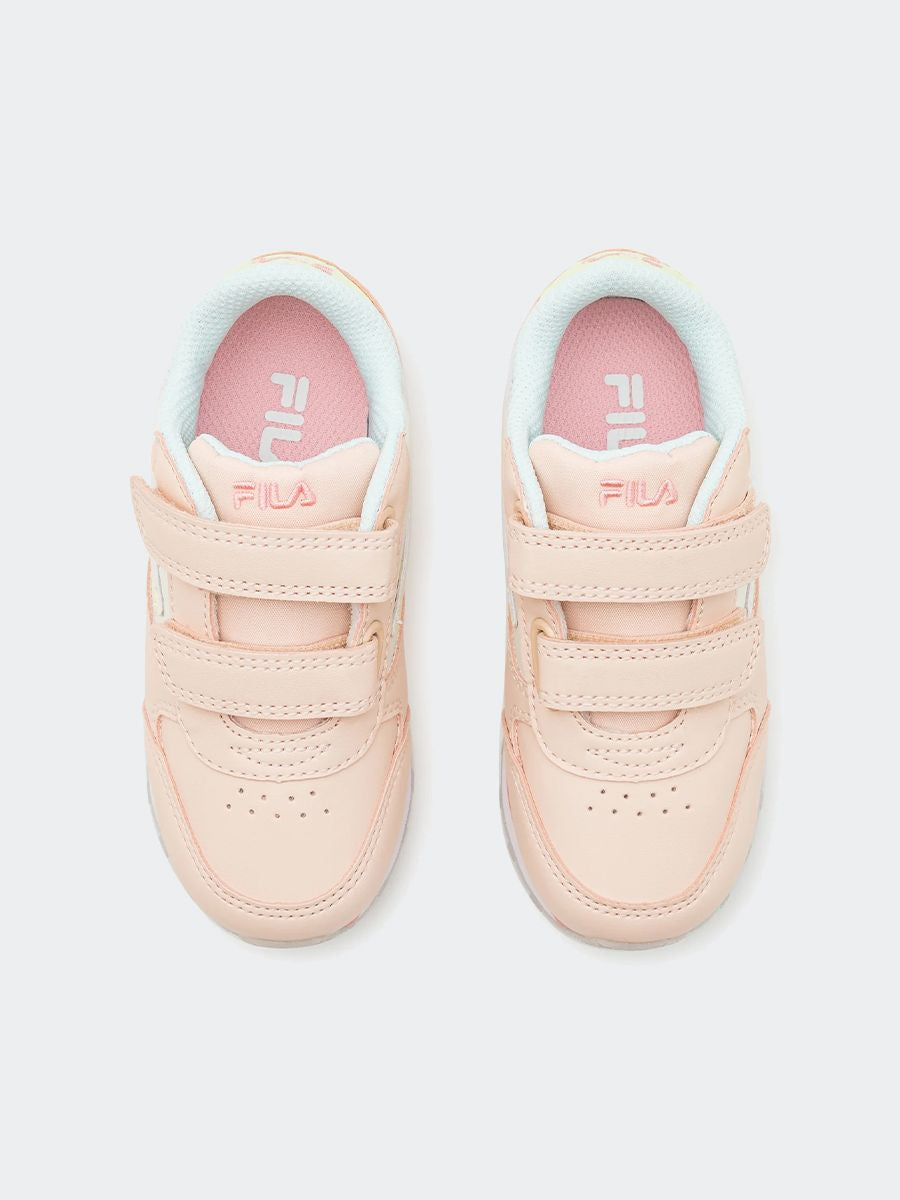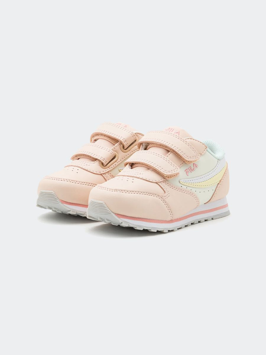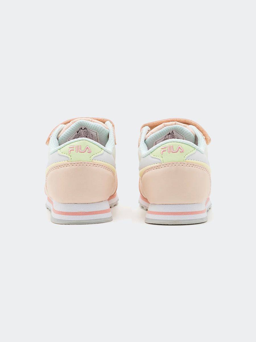 Sneakers Orbit Velcro Infants con logo Fila bianco blu rossa. Suola in gomma antiscivoloe fodera in tessuto. Allacciatura con strappo. Calzata confortevole con tomaia avvolgente
