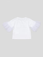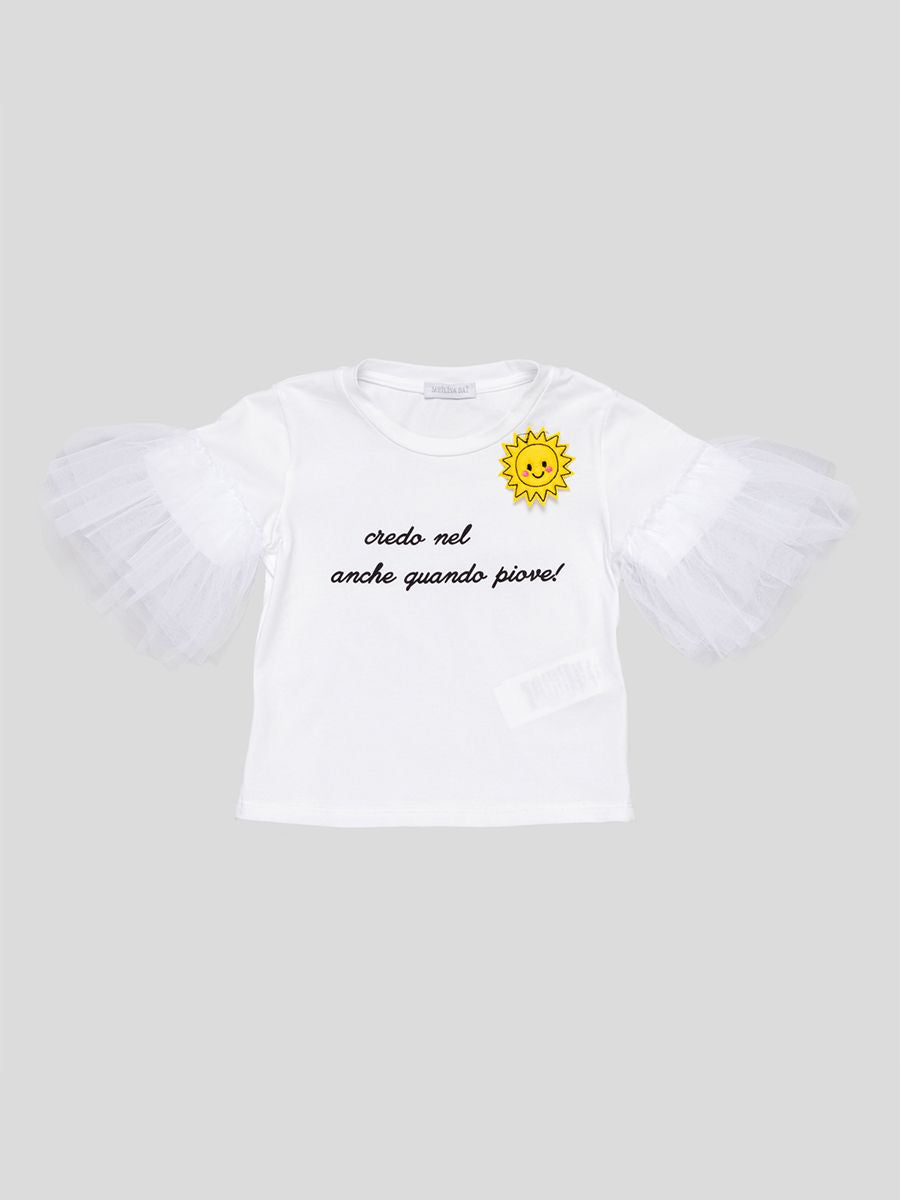 T-shirt stampa a contrasto di colore nera con tulle applicato sulle maniche per renderla più appariscente