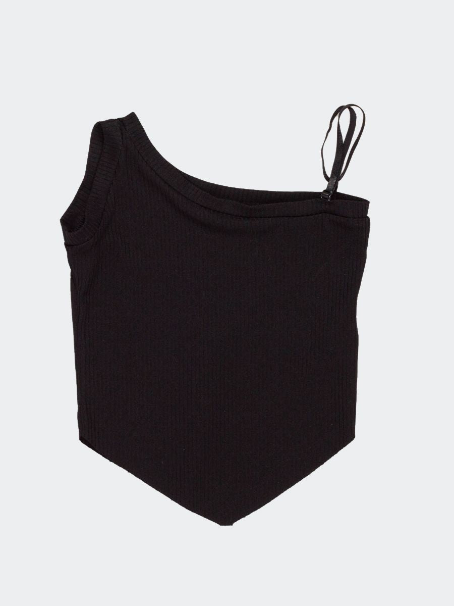 Top in morbida viscosa tinta unita con un lato smanicato e un lato bretella regolabile. Fondo a V
